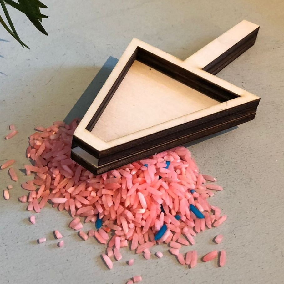 Houten trechter, aan het einde zit een opening zodat de rijst eruit kan.. Leuk in combinatie met gekleurde rijst.
