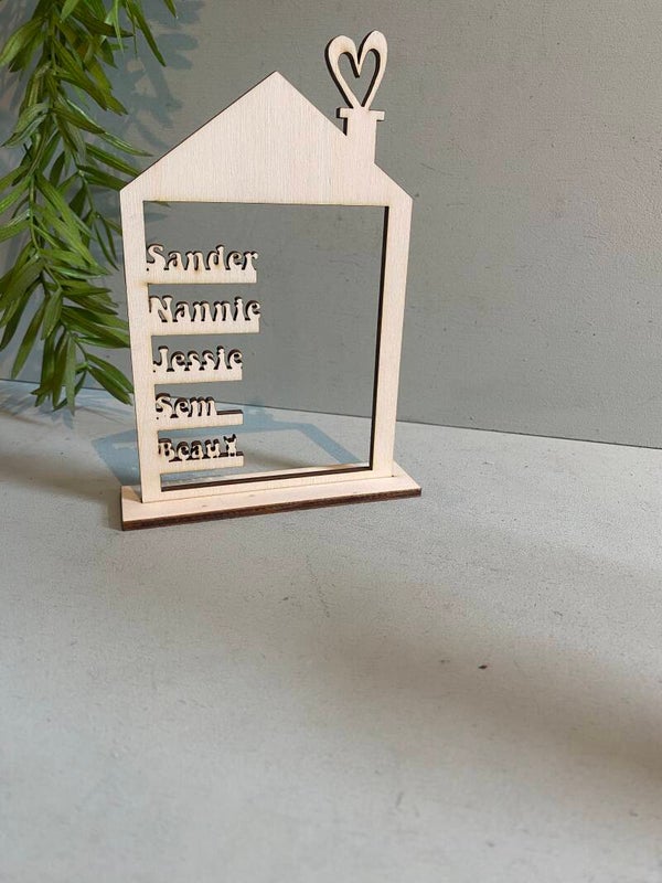 Dit leuke huisje met namen is perfect als cadeautje. Keuze uit 3 verschillende huisjes, en persoonlijke namen erbij. Zelfs mogelijk om huisdier incl icoontje erbij tevoegen. Incl standaardPrijs is voor 2 tot 5 namen