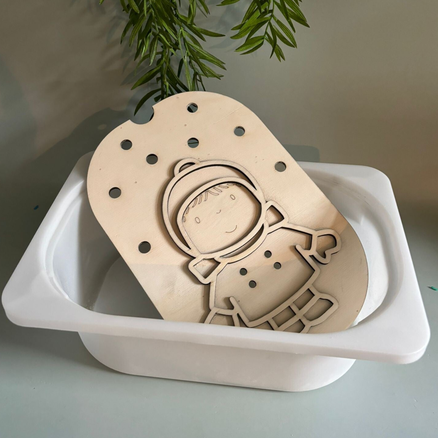 Dit houtenframe is gemaakt voor de trofastbak van ikea. In de vorm van een winterpoppetje met kleine gaatjes voor de pompoms en gekleurde rijst.
