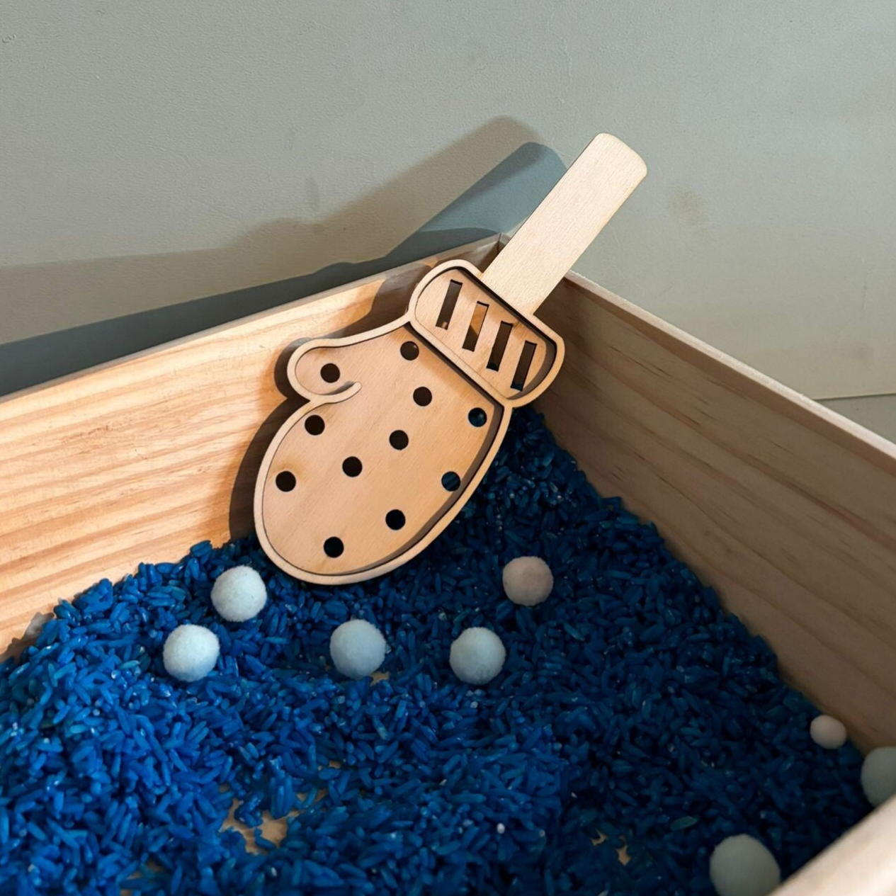 Houten speelzeef in de vorm van een want met gaatjes. Leuk in combinatie met gekleurde rijst en bijvoorbeeld kikkererwten.