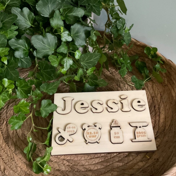Een houten puzzel met naam en alle geboorte informatie.