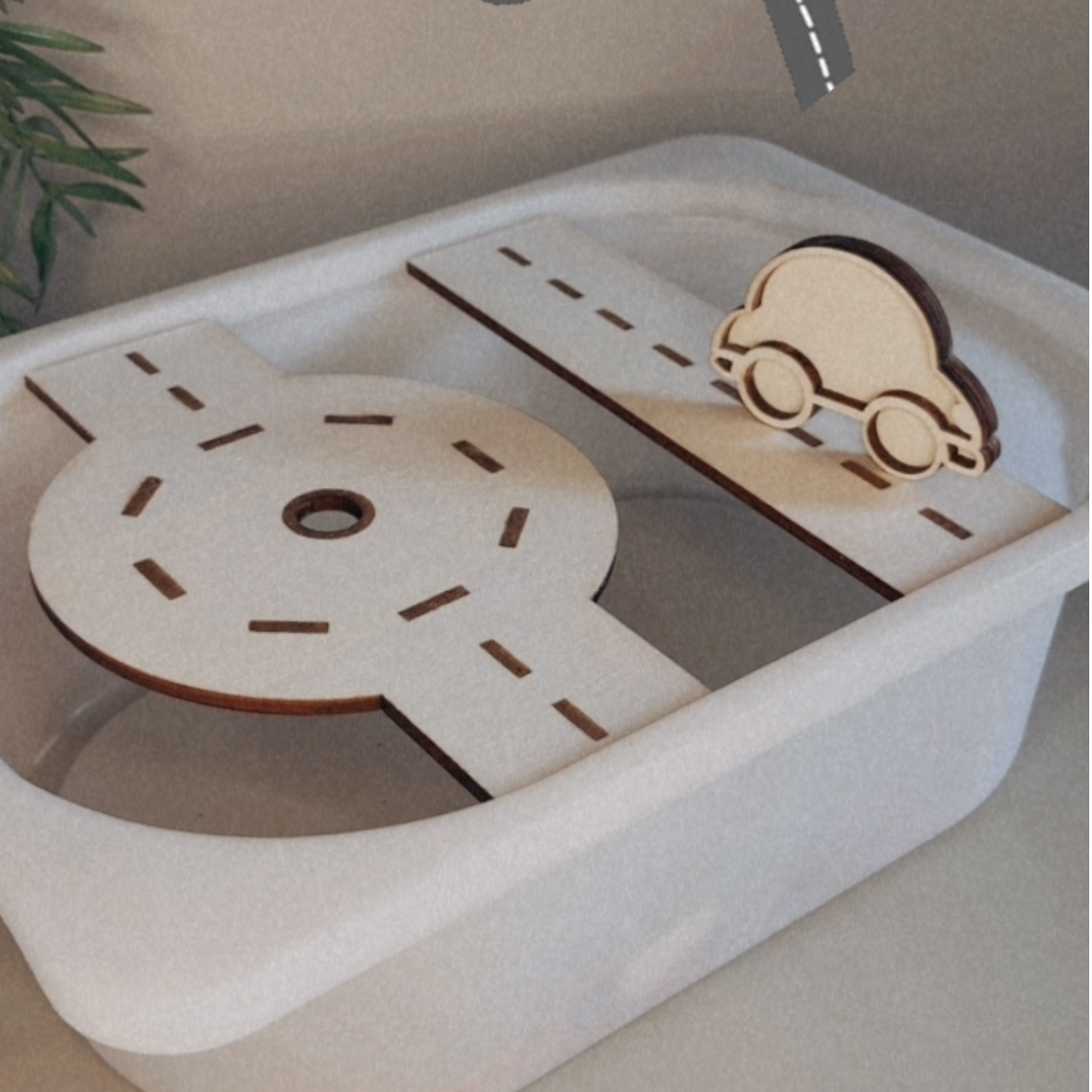 Dit houtenframe wegdelen voor trofast bak, een rotonde en een recht wegdeel. Voor de echte autoliefhebber incl houten speelframe in de vorm van een auto(10cm). Erg leuk in combinatie met natuurlijke speelmaterialen.