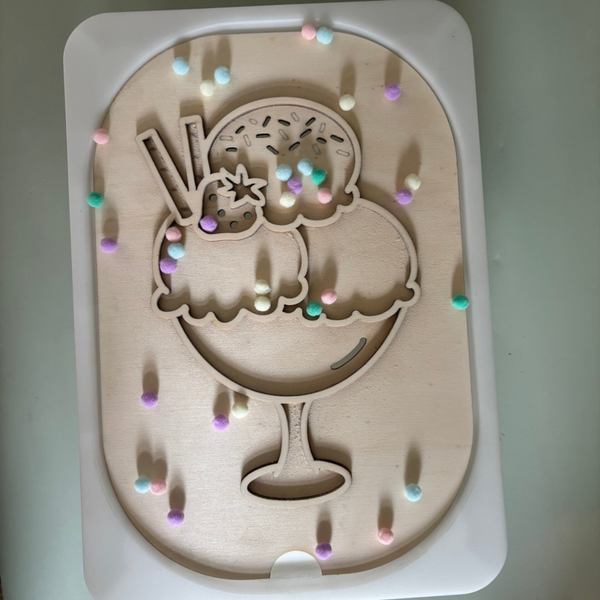 Dit houtenframe is gemaakt voor de trofastbak van ikea. In de vorm van een ijscoupe met kleine gaatjes voor de pompoms en gekleurde rijst.