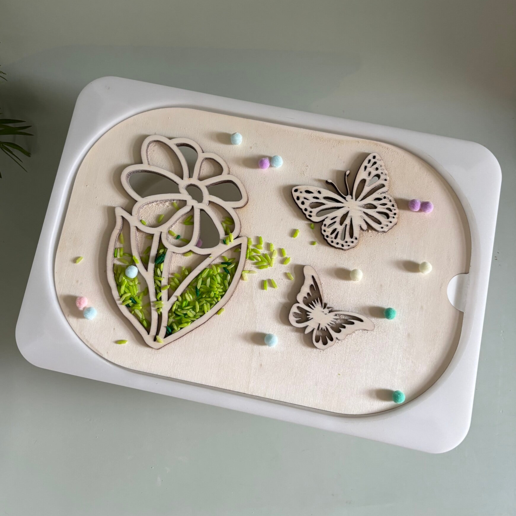 Dit houtenframe is gemaakt voor de trofastbak van ikea. In de vorm van een bloem met vlinders met kleine gaatjes voor de pompoms en gekleurde rijst.