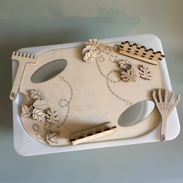 Dit houtenframe is gemaakt voor de trofastbak van ikea. In thema herfst incl 15 blaadjes, 2 harkjes en 2 hekjes. Ook leuk icm natuurlijke materialen zoals rijst of kikkererwten.
