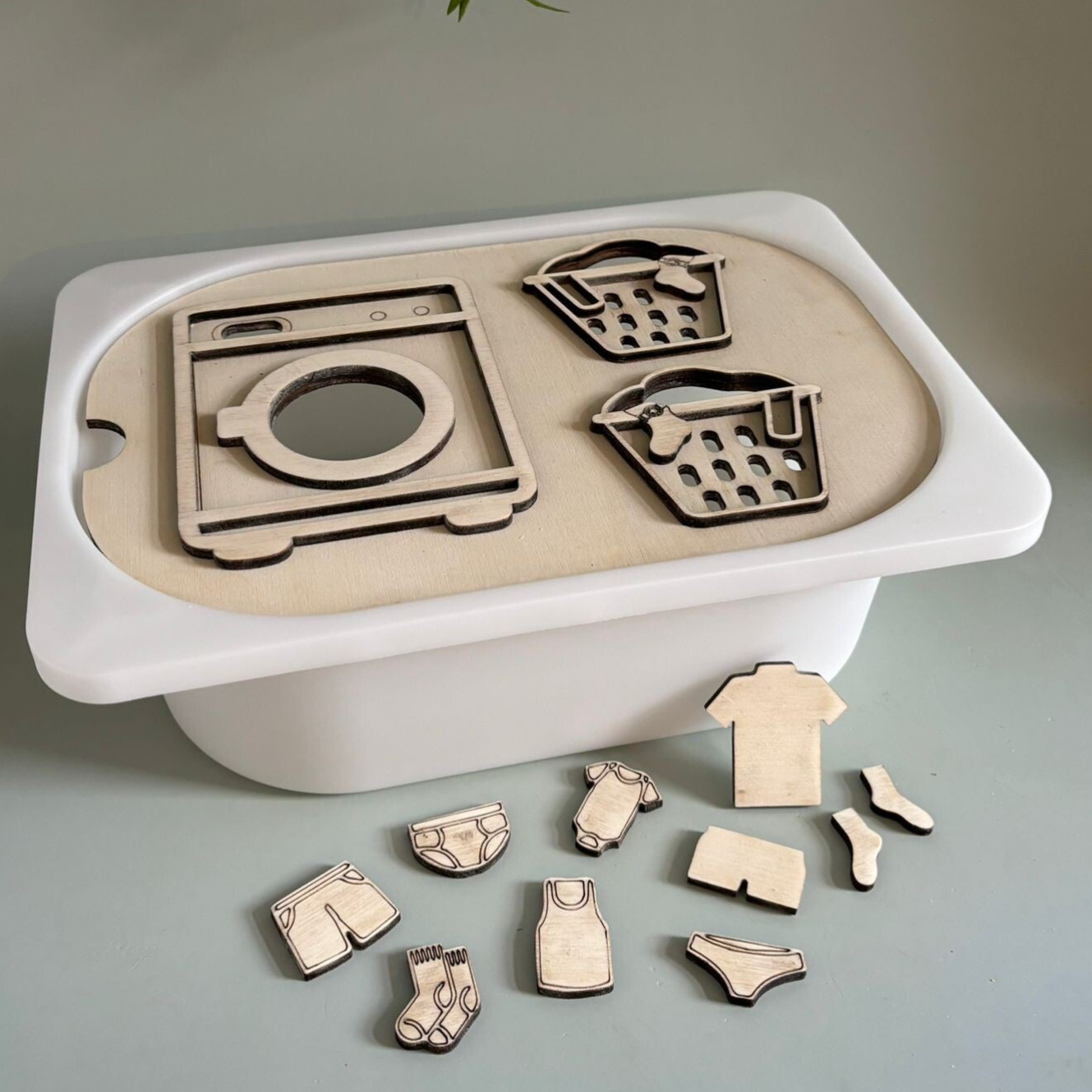 Dit houtenframe is gemaakt voor de trofastbak van ikea. In het thema wassen met een wasmachine en wasmanden, sorteren en wassen maar.