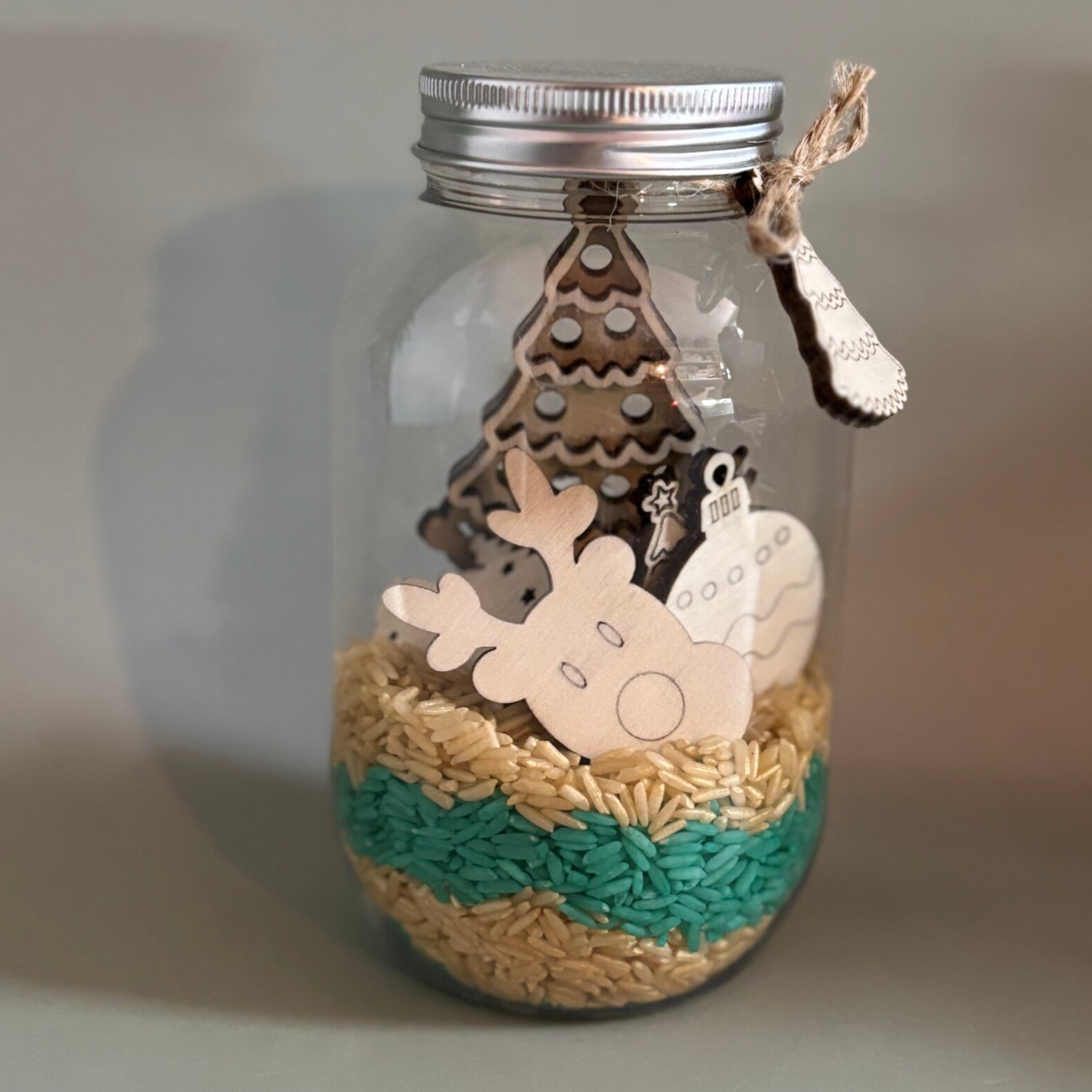 Een complete pot vol met speelplezier. Gekleurde rijst per thema, een mini zeefje in de vorm van een kerstboom en 7 losse houten figuurtjes.