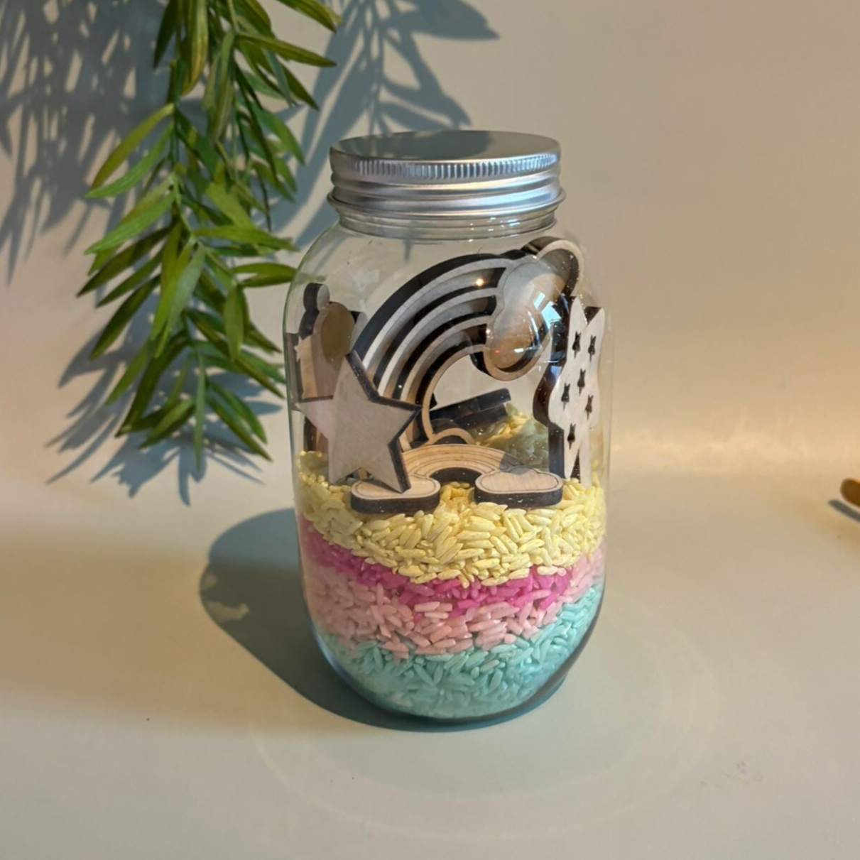 Een complete pot vol met speelplezier. Gekleurde rijst per thema, een mini frame in de vorm van een regenboog en 7 losse houten figuurtjes.