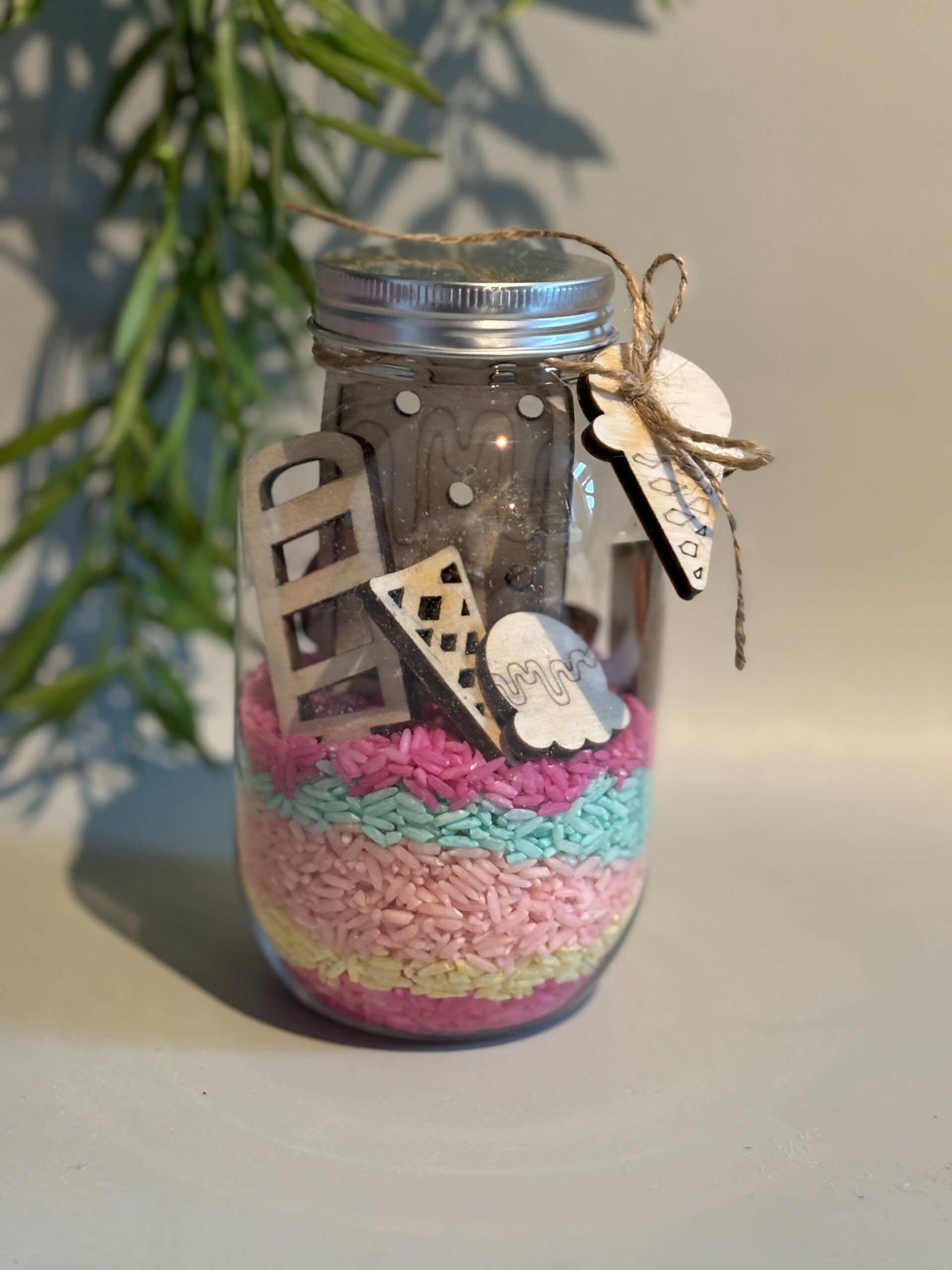 Een complete pot vol met speelplezier. Gekleurde rijst per thema, een mini zeefje in de vorm van een ijsje en 7 losse houten figuurtjes.