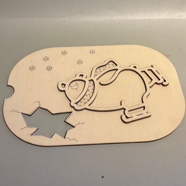 Dit houten frame is gemaakt voor de trofastbak van ikea. In het thema winter met schaatsende ijsbeer met gaatjes voor de pompoms en gekleurde rijst.