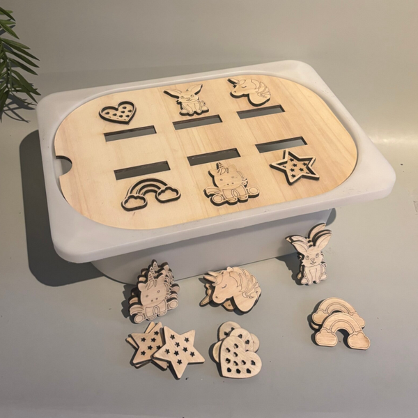 Dit houten frame is gemaakt voor de trofastbak van ikea. In het thema unicorn meegeleverde houten figuren.