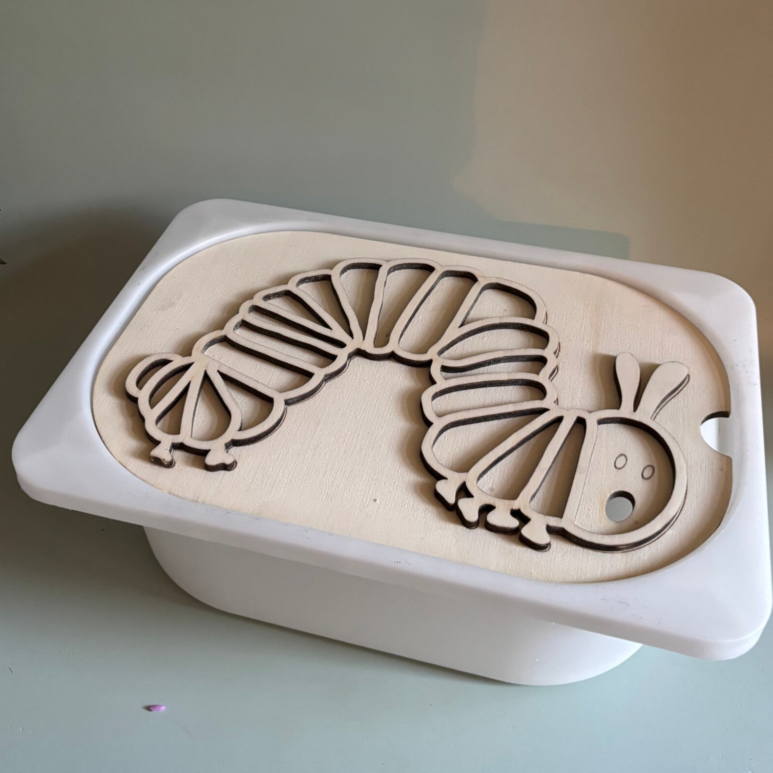 Dit houtenframe is gemaakt voor de trofastbak van ikea. In het thema van het rupsje.