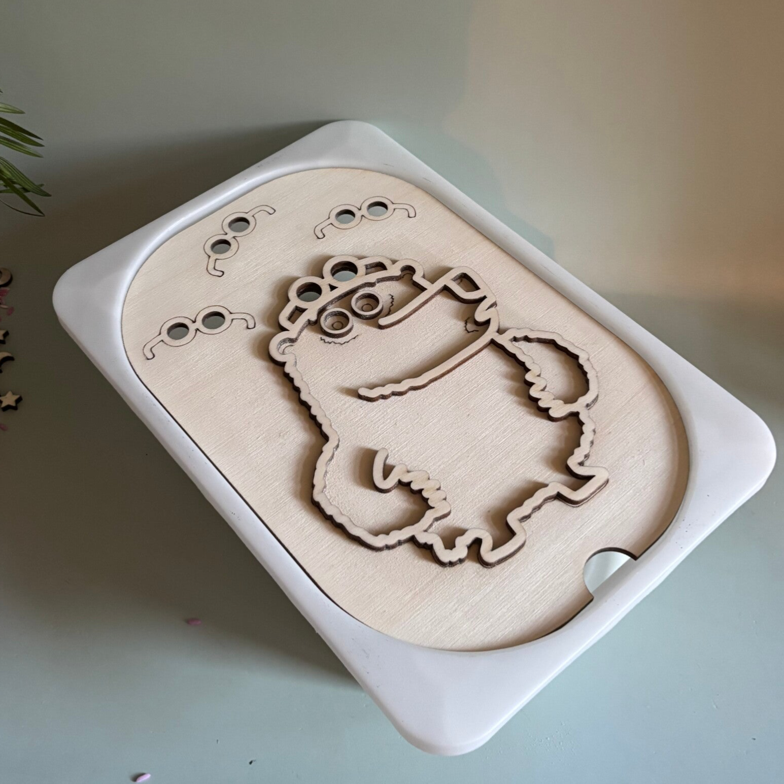 Dit houtenframe is gemaakt voor de trofastbak van ikea. In het thema de beer met de bril .