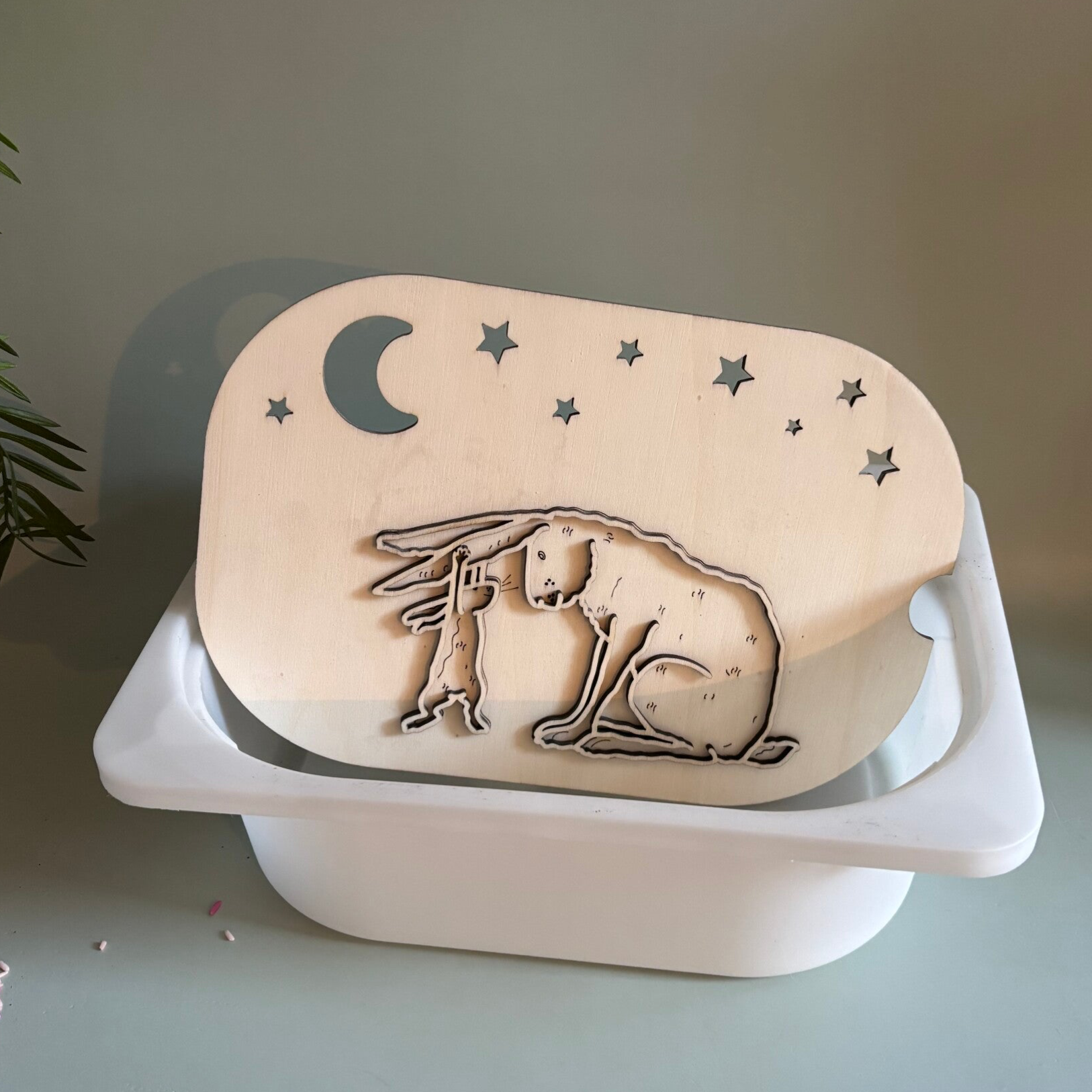 Dit houtenframe is gemaakt voor de trofastbak van ikea. In het thema van een haasje.