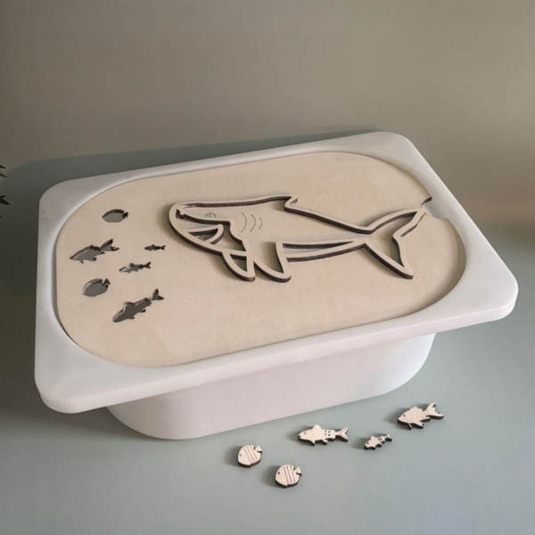 Dit houtenframe is gemaakt voor de trofastbak van ikea. Met een haai voor thema onderwaterwereld. Inclusief 5 kleine visjes.