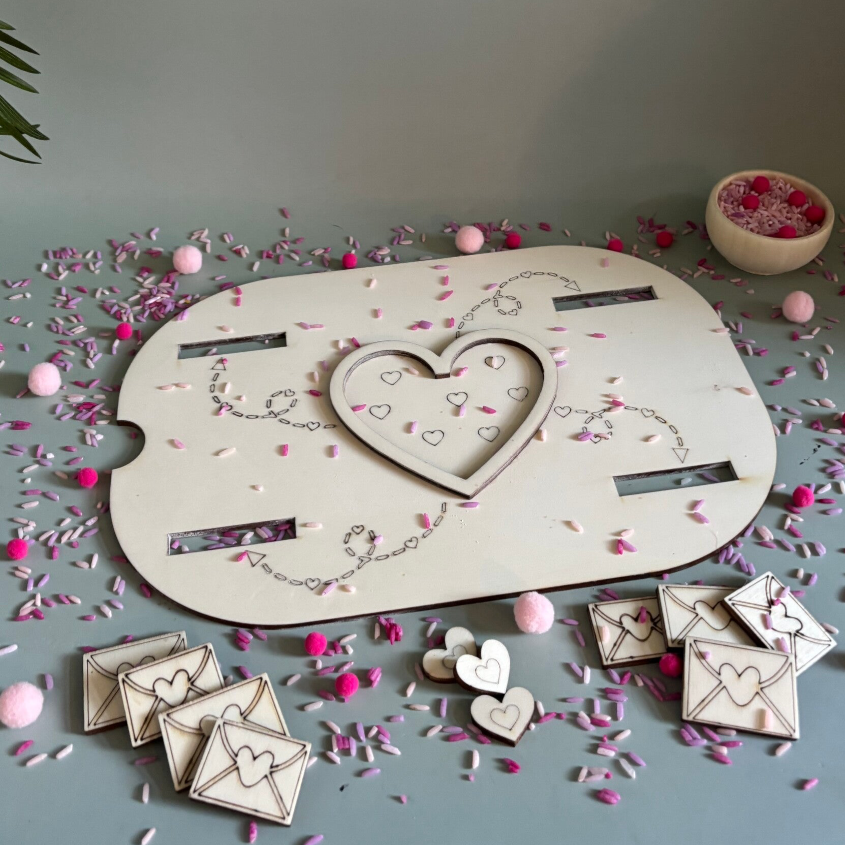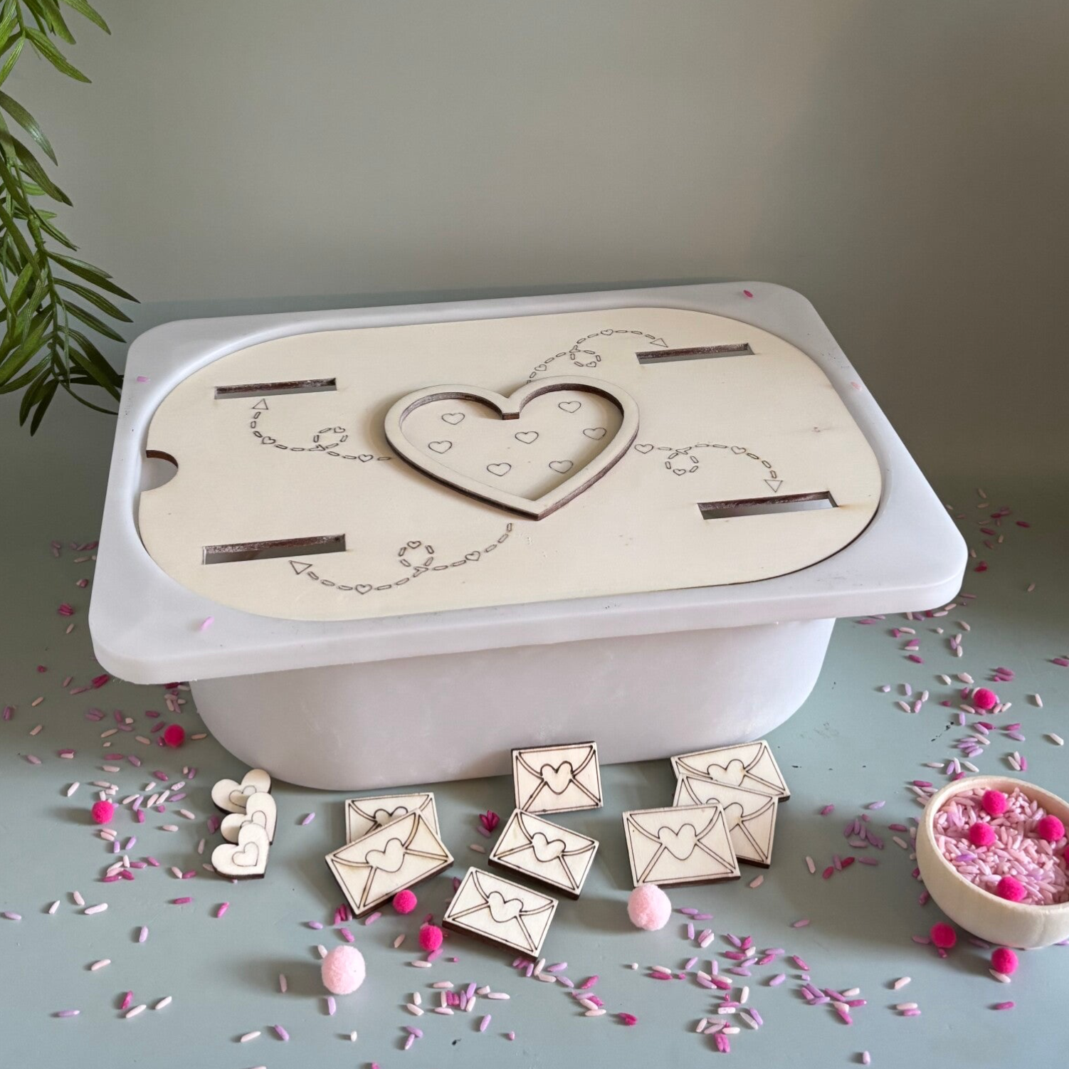 Dit houtenframe is gemaakt voor de trofastbak van ikea. In het thema van valentijnsdag. Inclusief 11 losse figuren zoals postenveloppen en hartjes.