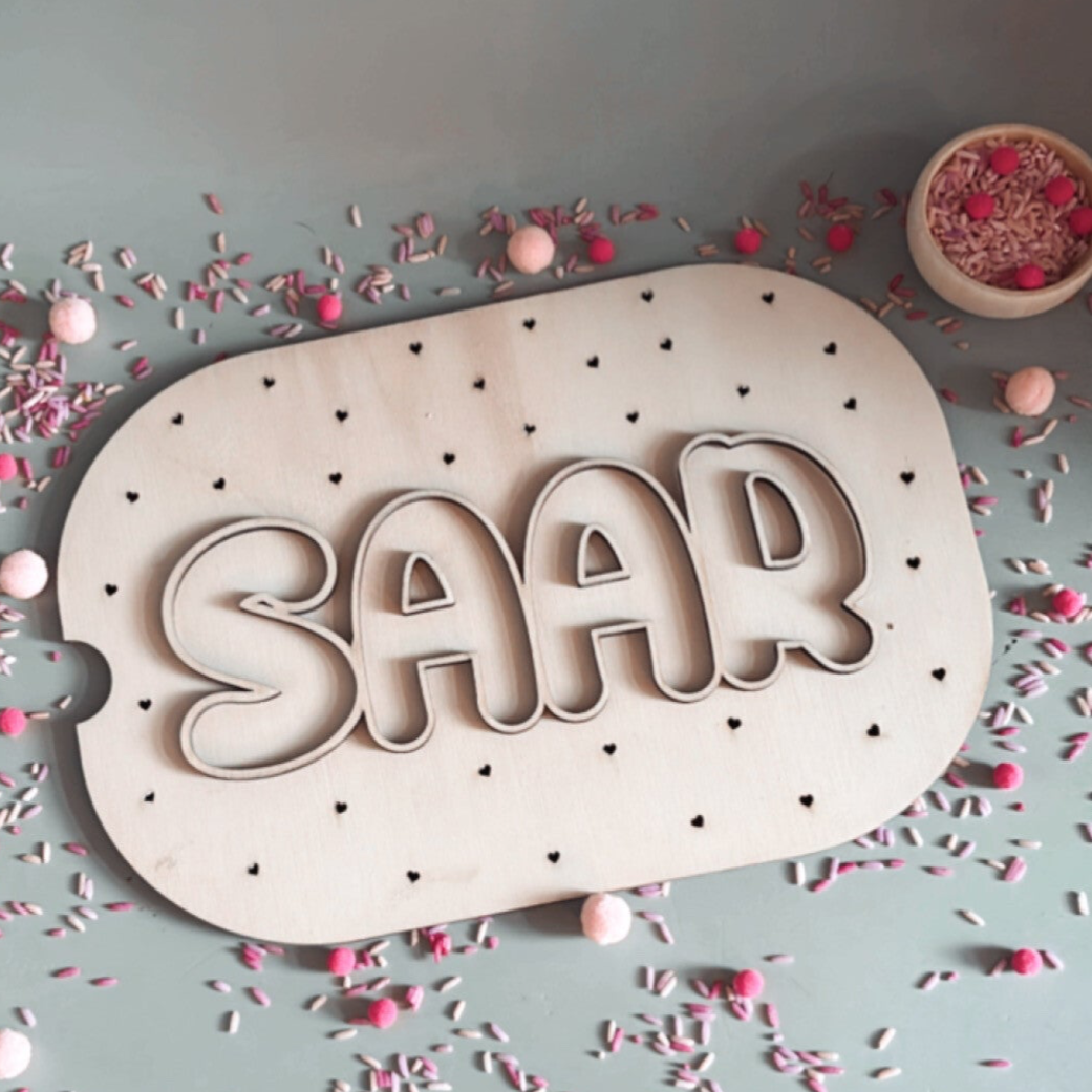 Dit houtenframe is gemaakt voor de trofastbak van ikea. Met je eigen naam!! Keuze uit hartjes of sterren.