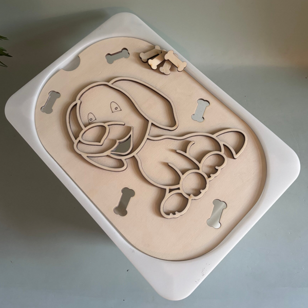 Dit houtenframe is gemaakt voor de trofastbak van ikea. Voor het thema dieren met een schattig hondje.