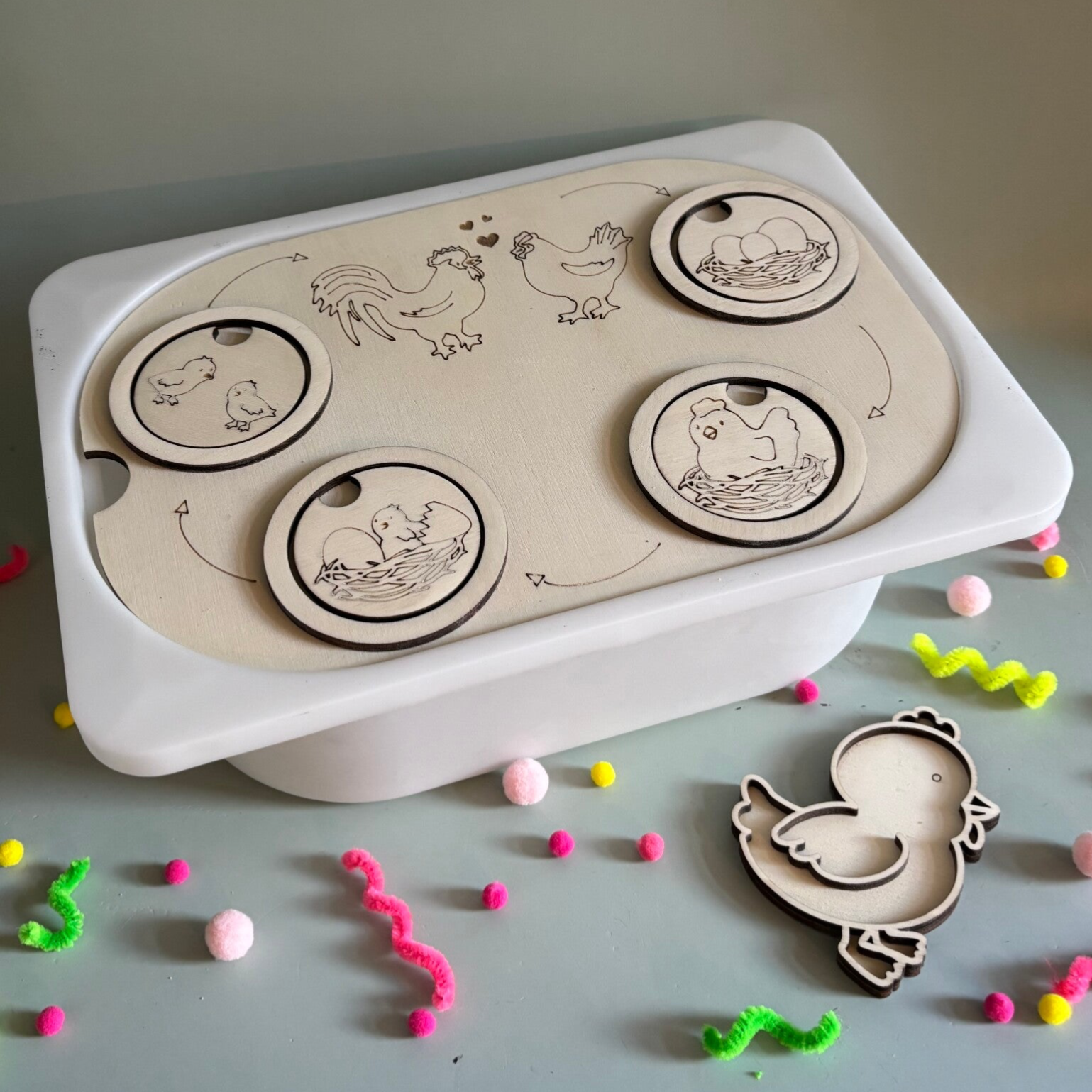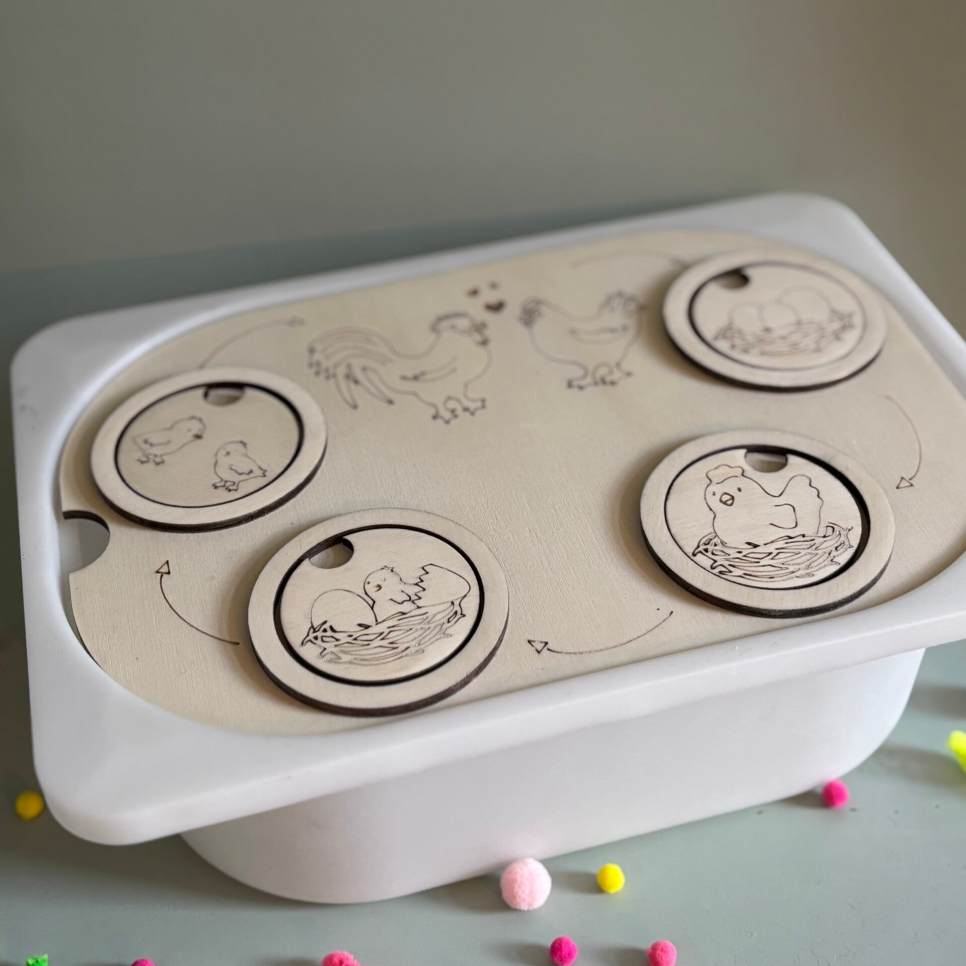 Dit houten frame is gemaakt voor de trofastbak van ikea. In het thema van ei tot kip, leuk en leerzaam.
