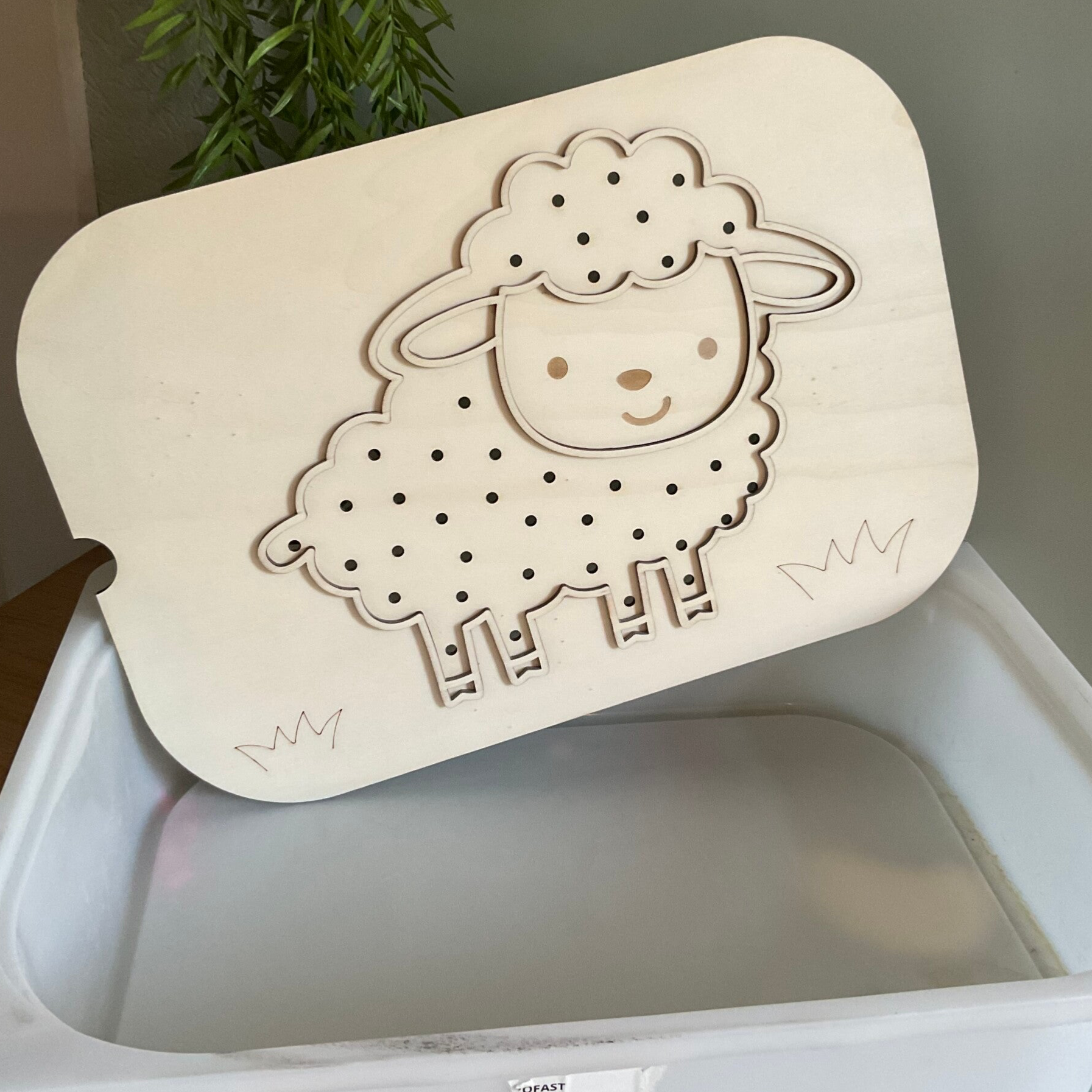 Dit houtenframe is gemaakt voor de trofastbak van ikea. In het thema schaapje. Met gaatjes voor extra effect, leuk icm natuurlijke materialen.