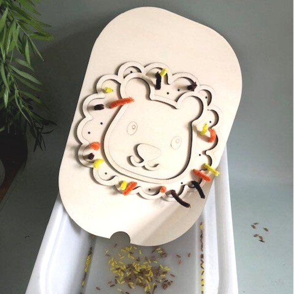 Dit houten frame is gemaakt voor de trofastbak van ikea. In het thema van de van een leeuw.