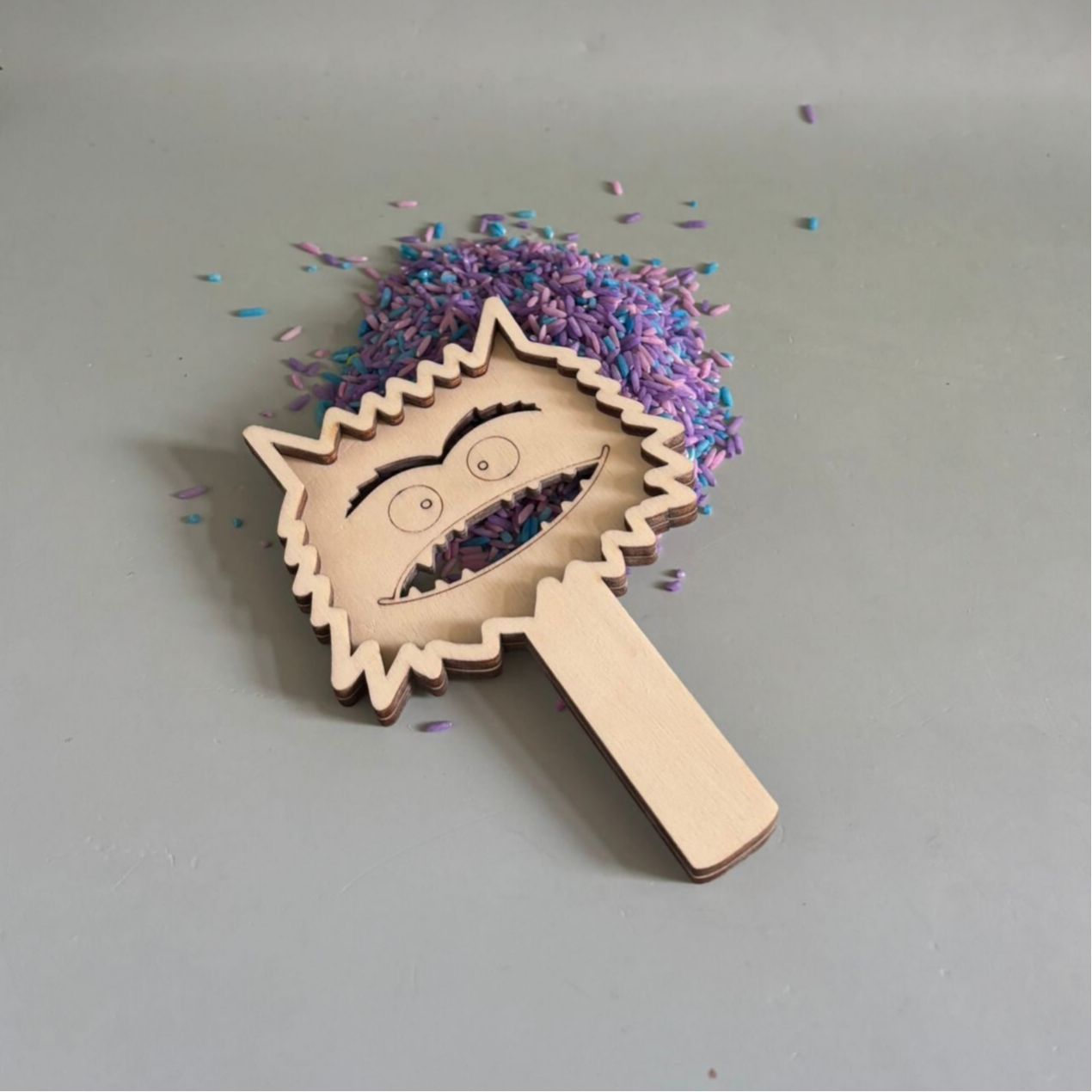 Houten speelzeef in de vorm van het kleurenmonster met een open mond. Leuk in combinatie met gekleurde rijst en bijvoorbeeld kikkererwten.
