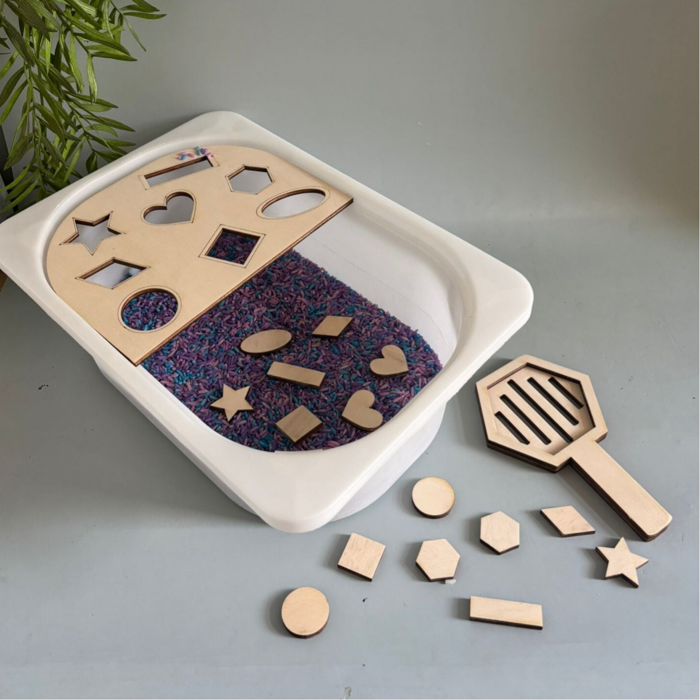Dit houten frame is gemaakt voor de trofastbak van ikea in het thema vormen. Met het vormenzeefje leren kinderen op een speelse manier vormen herkennen, sorteren en onderscheiden. Waardoor kinderen uitgedaagd worden om goed te kijken, te voelen en te proberen.
