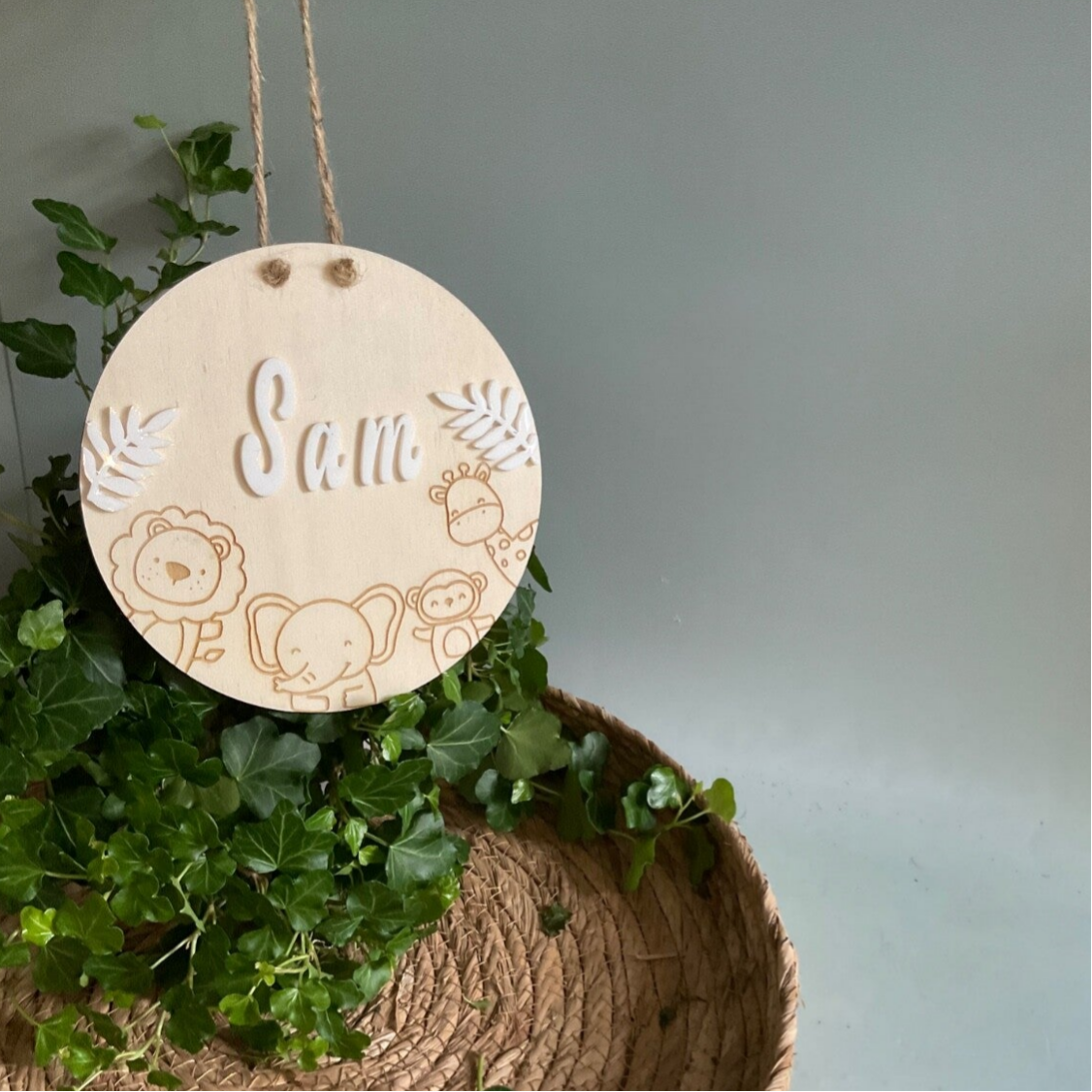 Op zoek naar een uniek en liefdevol cadeautje? Dit houten borden is versierd met schattige dieren en worden helemaal persoonlijk gemaakt met een naam in plexiglas.