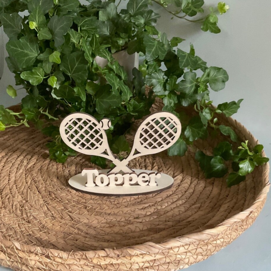 Op zoek naar een origineel en persoonlijk cadeautje? Deze houten standaard met een figuur van een tennisracket is een warm gebaar voor elke gelegenheid.