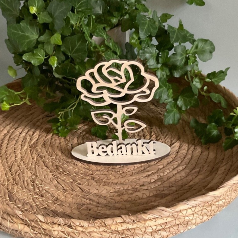 Op zoek naar een origineel en persoonlijk cadeautje? Deze houten standaard met een figuur van een roos is een warm gebaar voor elke gelegenheid.