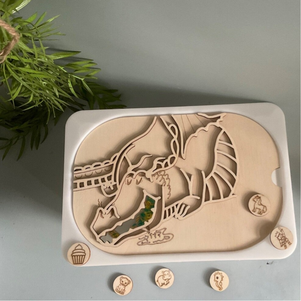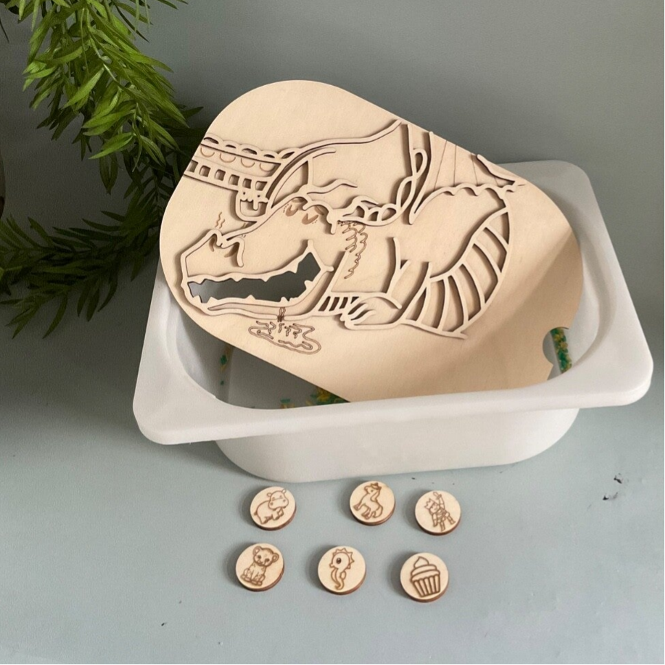 Dit houtenframe is gemaakt voor de trofastbak van ikea. In het thema van de draak. Hoe leuk is dat speelmateriaal voor bij het boekje. Ook verkrijgbaar in speelframe M.