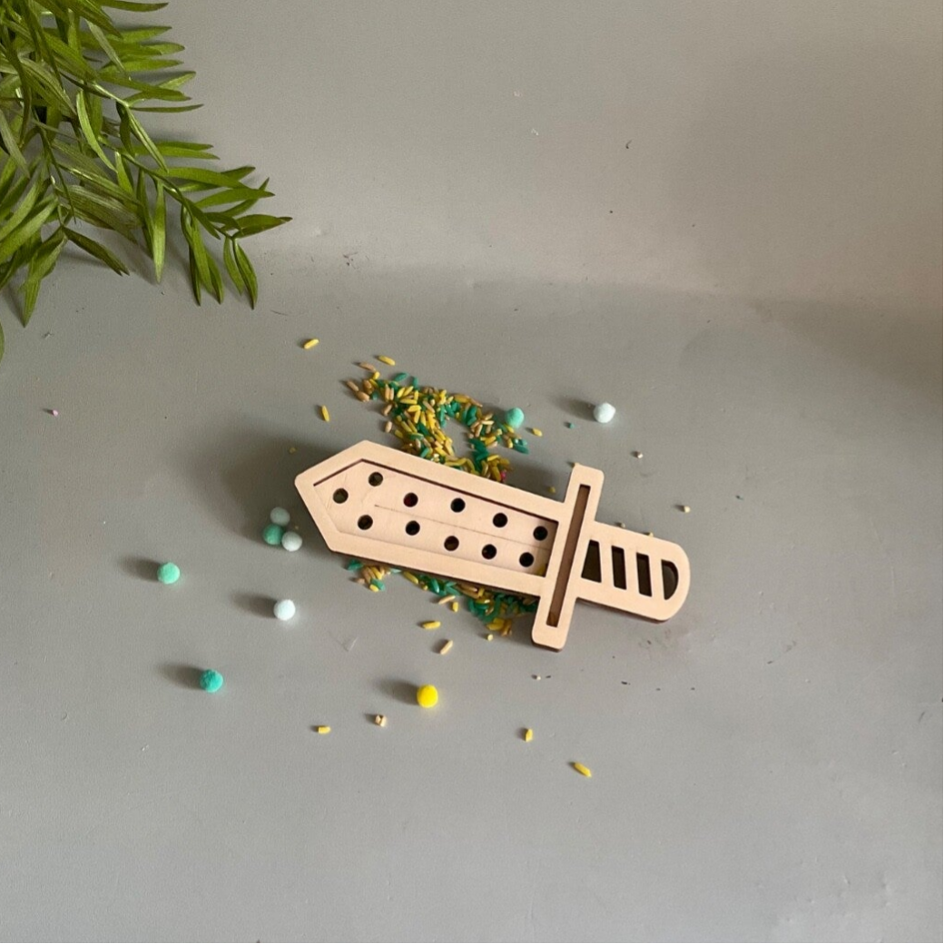 Houten speelzeef in de vorm van een zwaard met gaatjes. Leuk in combinatie met gekleurde rijst en bijvoorbeeld kikkererwten.