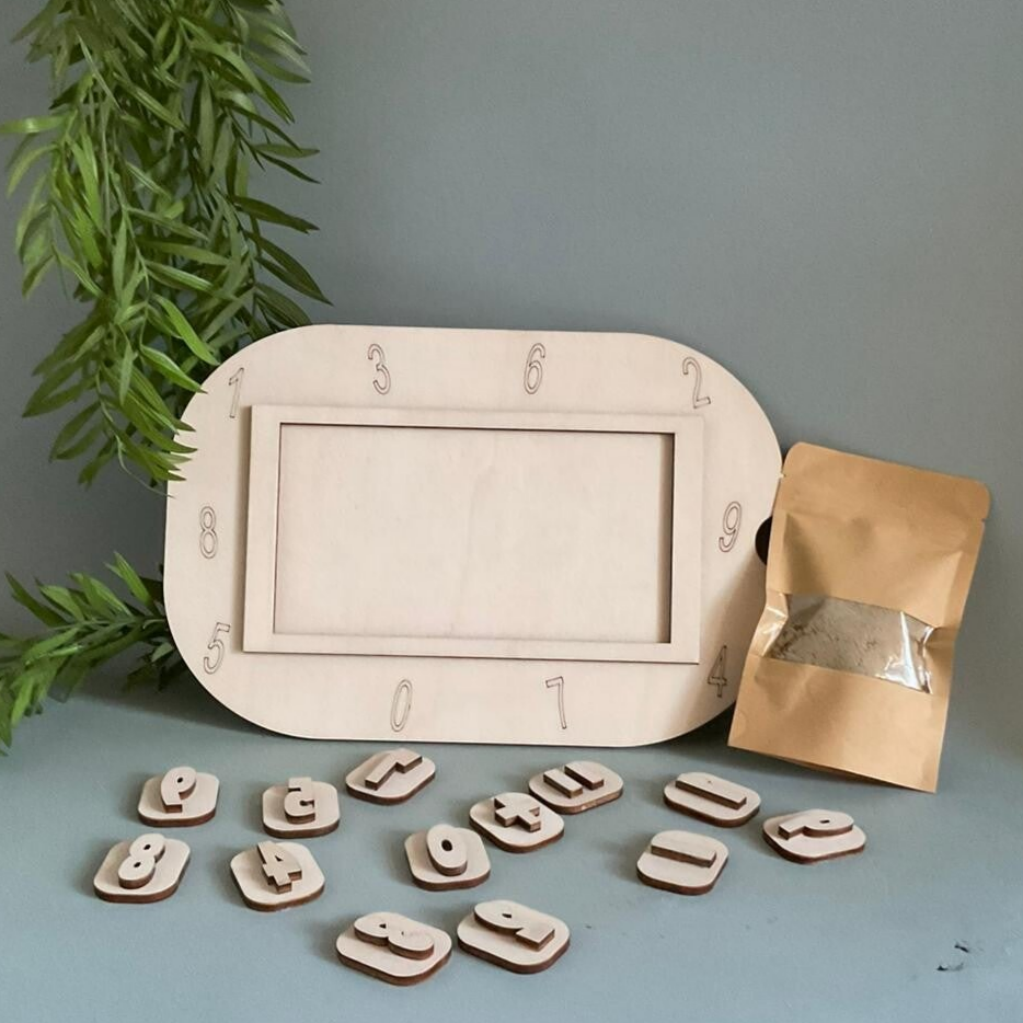 Dit houten frame is gemaakt voor de trofastbak van ikea in het thema tellen. Met de stempels leren kinderen op een speelse manier cijfers herkennen, en sommen maken.