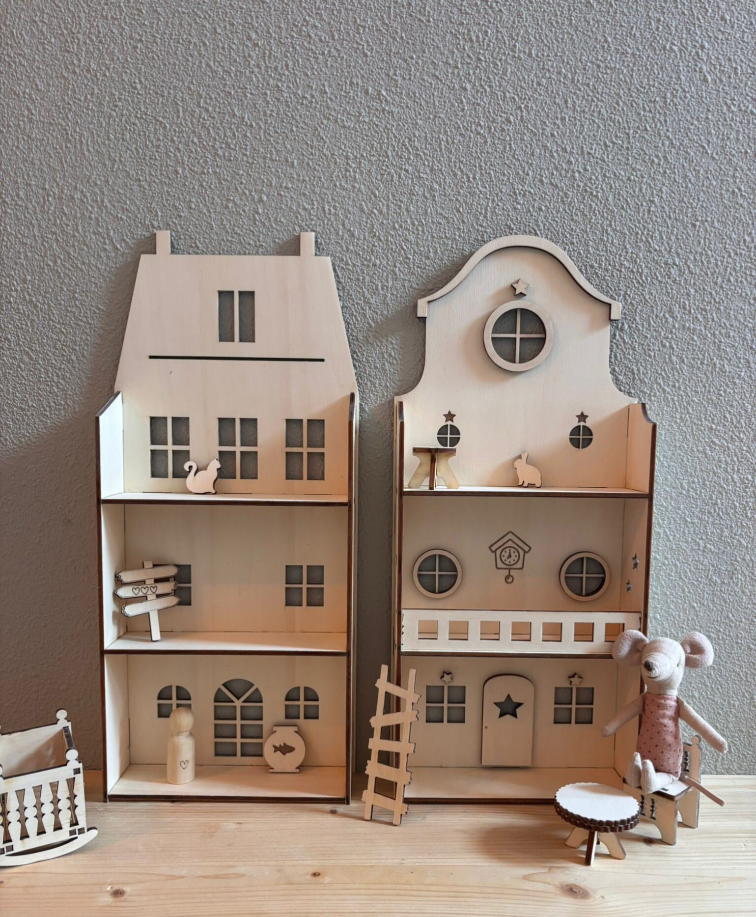 De poppenhuizen zijn gemaakt van hout en ontworpen voor jarenlang speelplezier.