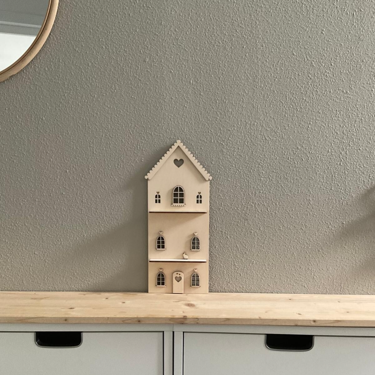 Wil je het extra persoonlijk maken? Dan is het poppenhuis optioneel te personaliseren met een naam. Hierdoor wordt elk huisje uniek – perfect als kraamcadeau, verjaardagscadeau of als bijzonder item voor je eigen kind.