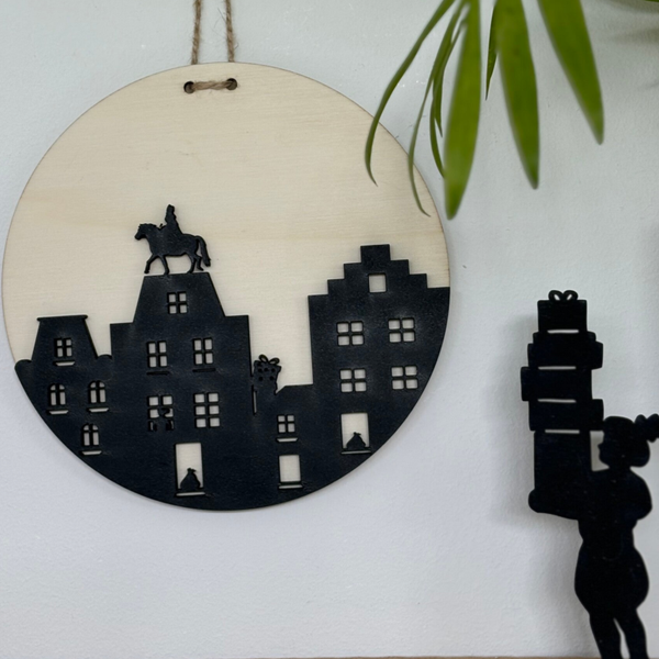 Dit leuke ronde houten bord is een echte blikvanger tijdens de Sinterklaas periode. Leuk om voor het raam te hangen of op de vensterbank te zetten. Mogelijk met een naam of tekst.
