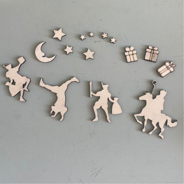De set bestaat uit een maan en sterren,3 pietjes ,sinterklaas en cadeautjes.