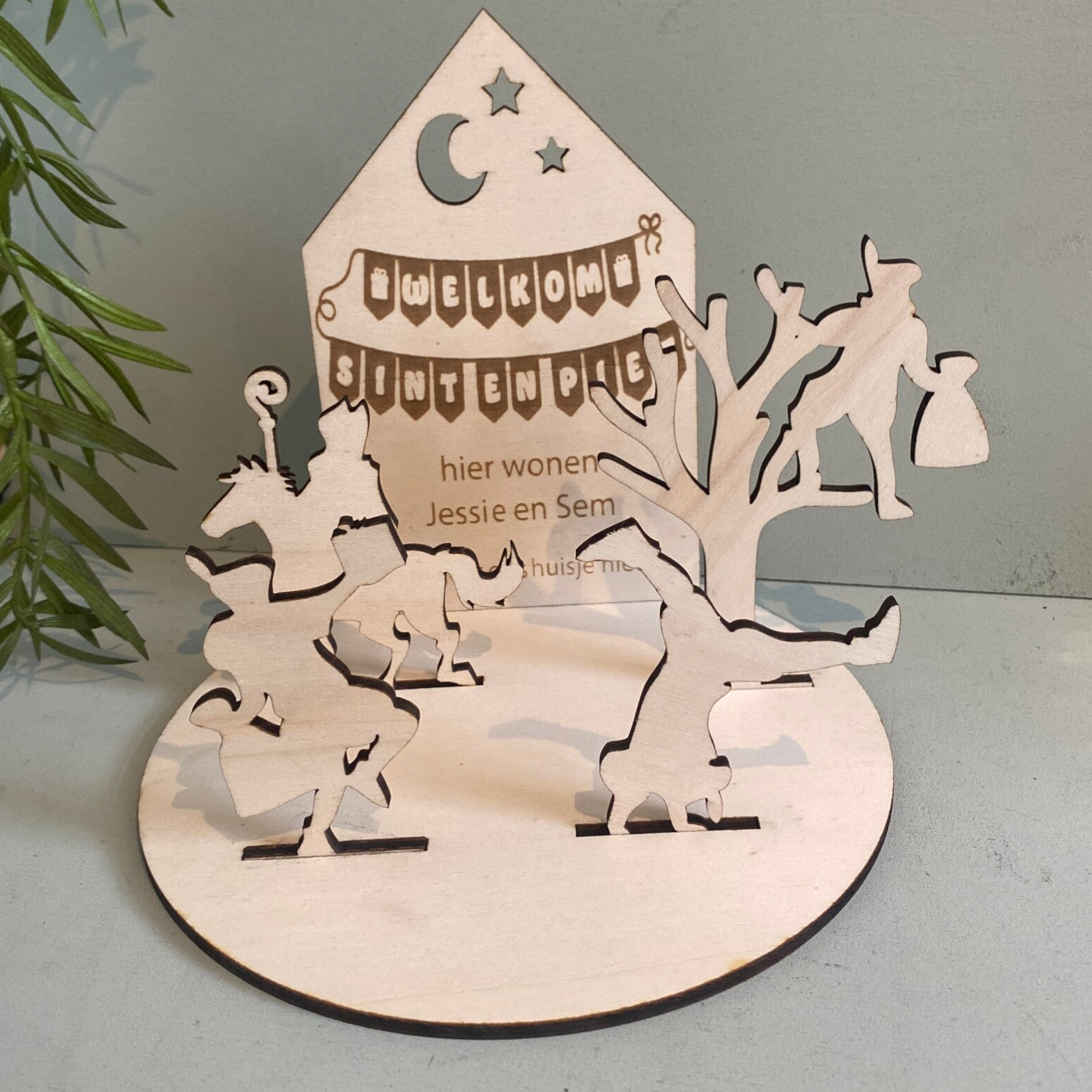 Dit ronde plateau is in thema sinterklaas, een huisje met namen van de kinderen 2 pietjes, sinterklaas op paard en een boom met een pietje