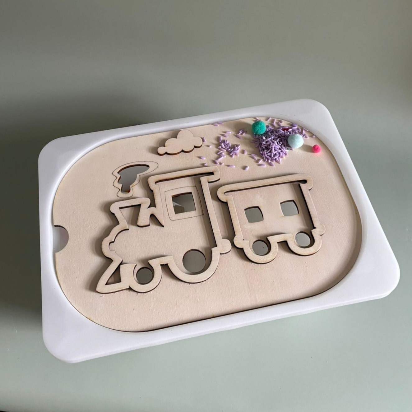 Dit houtenframe is gemaakt voor de trofastbak van ikea. In de vorm van een trein met kleine gaatjes voor de pompoms en gekleurde rijst.