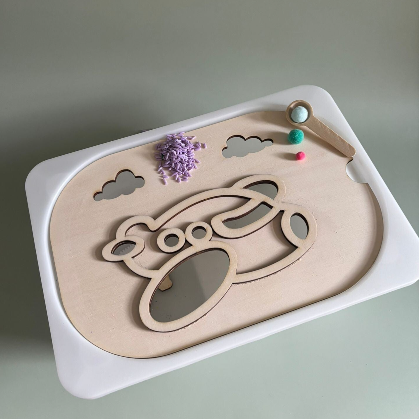 Dit houtenframe is gemaakt voor de trofastbak van ikea. In de vorm van een vliegtuig met kleine gaatjes voor de pompoms en gekleurde rijst.