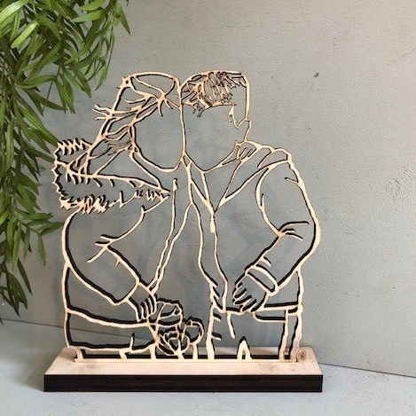 Met een lijntekening uit hout van een eigen foto heb je een hele mooie herinnering op een standaard.